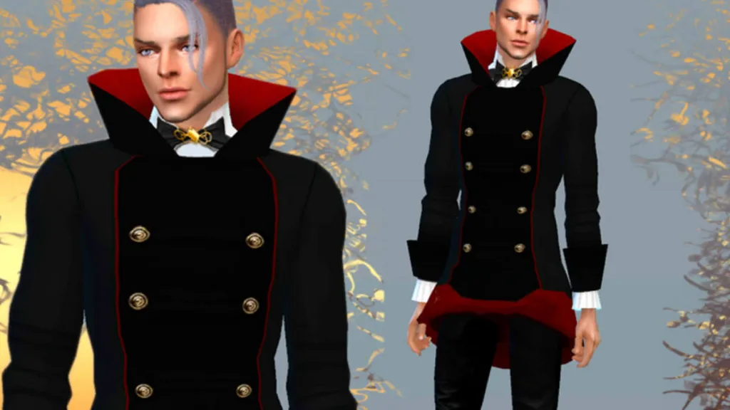 To kick this list off we have a classic vampire outfit that players can use to dress up their masculine Sims. High collar? Check. A black and red combination? Check. Elements of darkness with a fancy spin? Check. There’s no denying it – this setup is an absolute cliche classic option when it comes to clothing with a vampire flare. After all, it looks like the typical garments that any vampire character would wear.
