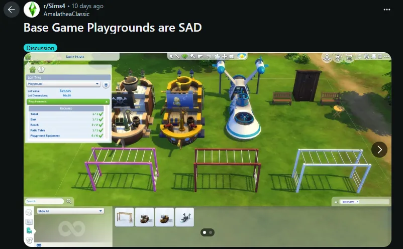Fair warning, it’s another Reddit story. But it’s something we might not’ve caught ourselves if user AmalatheaClassic hadn’t pointed it out. The new playground lot has some basic requirements for qualifying, such as benches, sinks, toilets etcetera. So far, so normal.